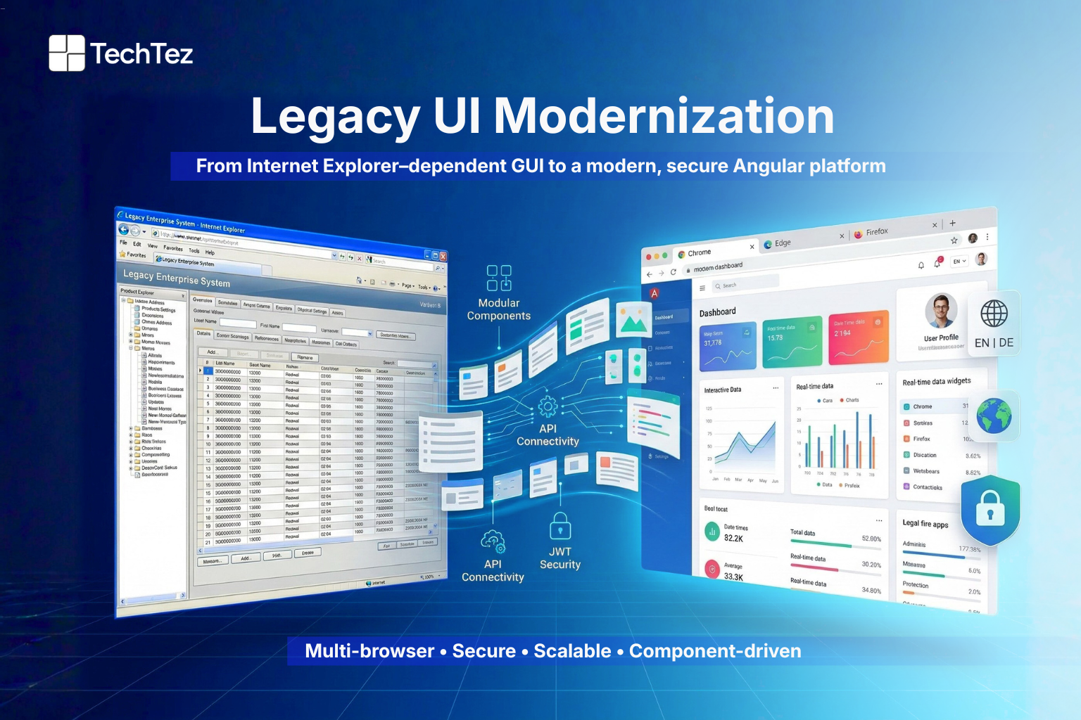 By transforming a legacy, IE-dependent GUI into a modern Angular-based platform, TechTez helped the client future-proof their application ecosystem delivering improved security, faster customization, and a superior user experience.